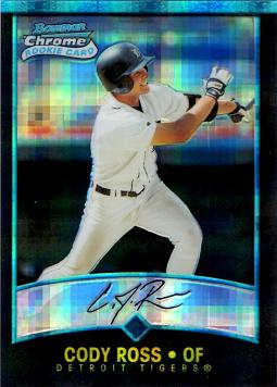 The 2001 Bowman Chrome Refractor version is one of the more rare and difficult to find Cody Ross Rookie Cards.