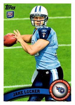 This is an official Jake Locker Rookie Card showing him with the Tennessee Titants.  Card was produced by Topps Football in 2011.